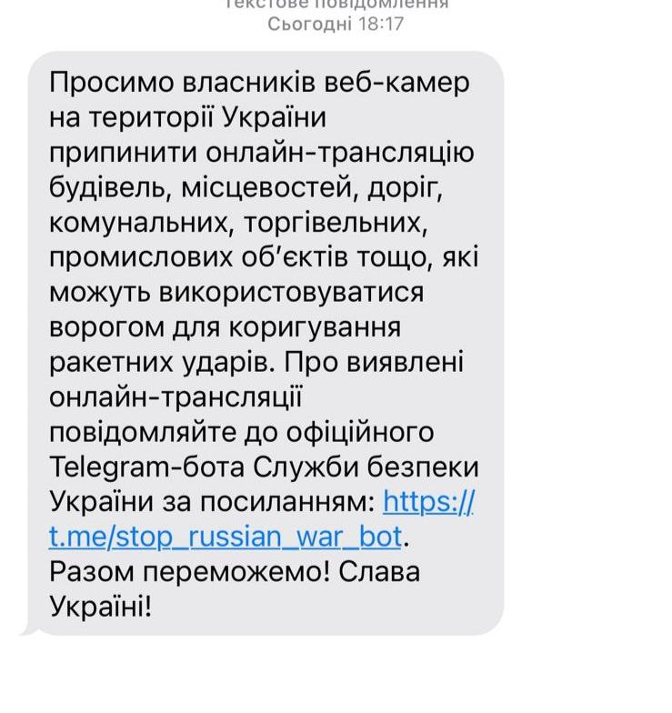 Служба безпеки закликає власників вуличних вебкамер припинити онлайн-трансляції зі своїх пристроїв, а громадян – повідомляти про виявлені стріми з таких камер на офіційний чат-бот СБУ: t.me/stop_russian_war_bot.