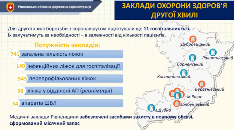 Як розповів голова Рівненської обласної державної адміністрації Віталій Коваль, для другої хвилі надання допомоги хворим із коронавірусною інфекцією підготували 11 баз.
