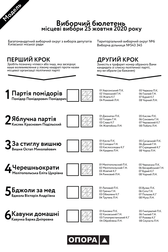Як виглядатиме такий бюлетень? Ліворуч – назва партії та першого номера у єдиному районному чи обласному списку цієї партії; посередині дві клітинки, в одній з яких треба поставити позначку, а в сусідній з нею трафаретом вписати цифри; праворуч – перелік кандидатів від кожної з партій з номерами, які треба вписувати в трафарет. Умовний приклад можна побачити на прикріпленому зображенні, яке підготувала Громадянська мережа ОПОРА