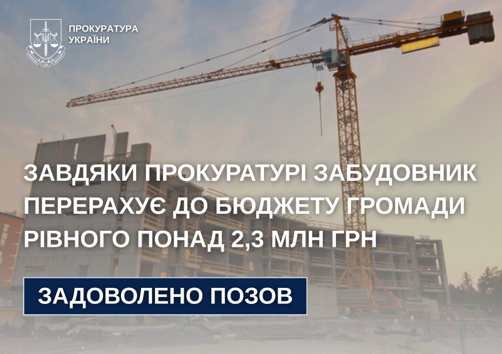 Господарський суд ухвалив рішення про стягнення з забудовника понад 2,3 млн гривень на користь бюджету Рівненської громади. Позов подала прокуратура.