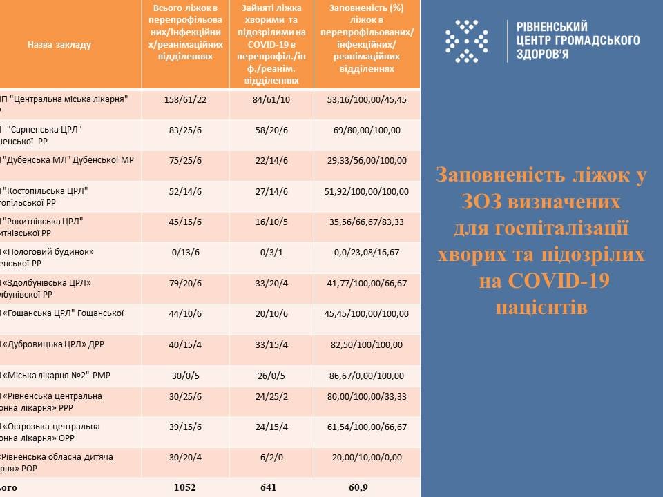 В обласному центрі громадського здоров’я повідомили, що заповненість ліжок в 13-ти лікарнях 1-ї хвилі для госпіталізації хворих та підозрілих на COVID-19 пацієнтів у Рівненській області станом на 09.30 23 жовтня становить понад 60%.
