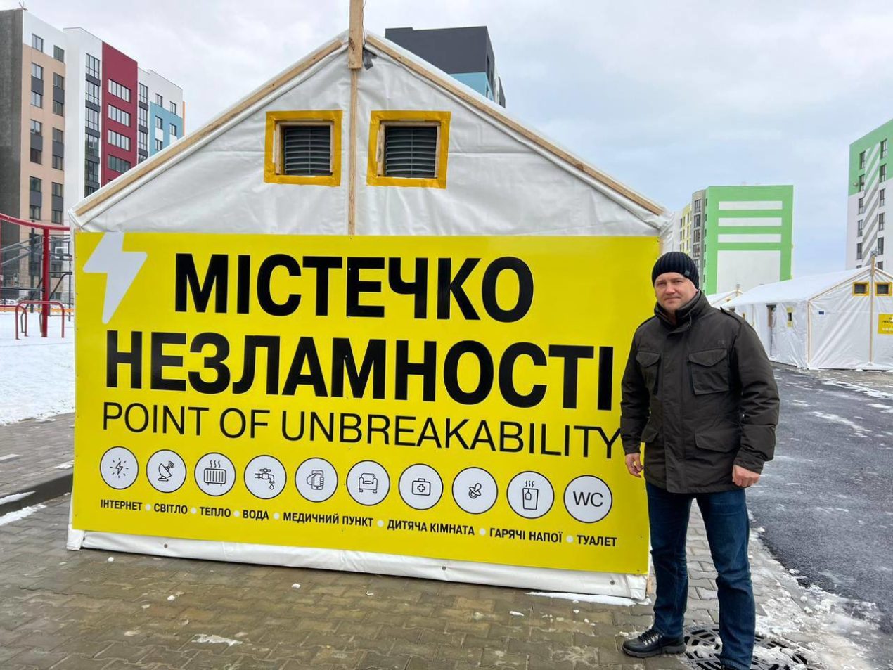Тут є світло, тепло та інтернет. Можна зарядити гаджети. Завжди є чергові медик, соцпрацівник та поліцейський. Конструкції водонепроникні та мають вогнезахисне покриття.