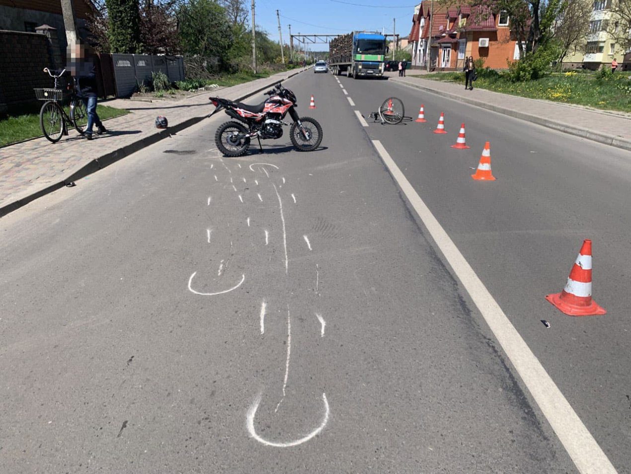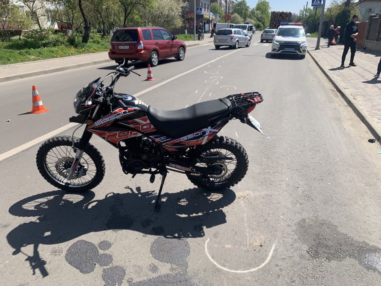 Водій мотоцикла «Geon», 18-річний житель села Яполоть, допустив наїзд на 52-річного місцевого жителя, який їхав на велосипеді по краю проїзної частини. Зі слів мотоцикліста, кермувальник двоколісного різко змінив напрямок руху.