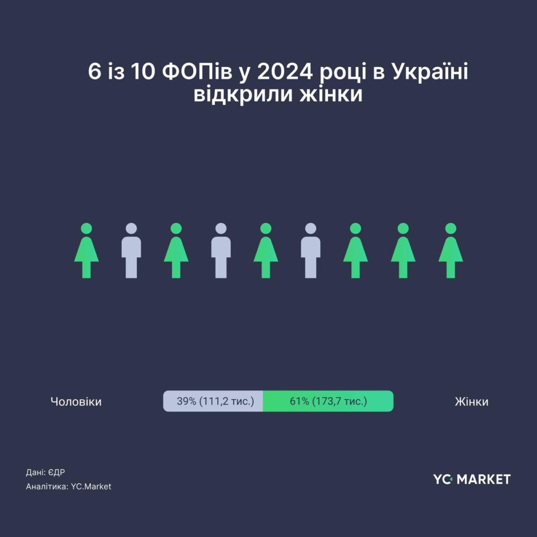 Продовжується тренд на зростання кількості жінок серед нових підприємиць: 61% зареєстрованих ФОПів у 2024 році належить жінкам, 49% – чоловікам.