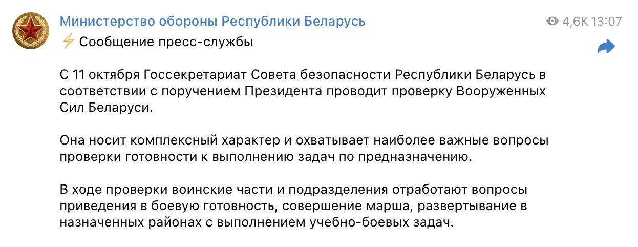 Прес-служба міноборони рб повідомила початок перевірки Збройних Сил Білорусі з 11 жовтня 2022 року.
