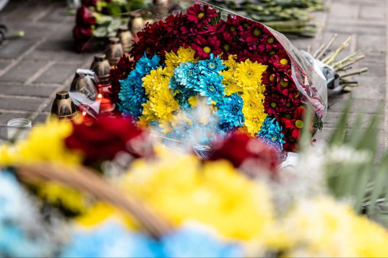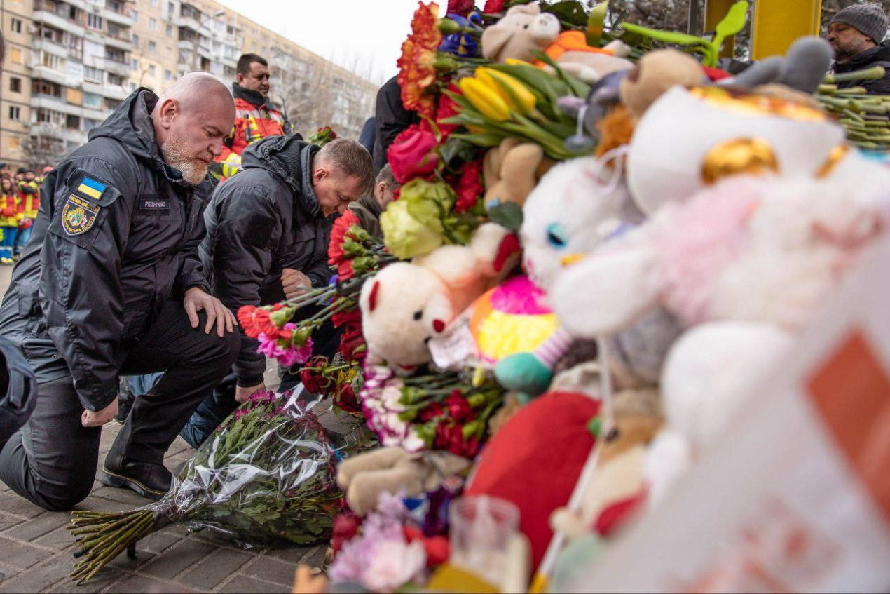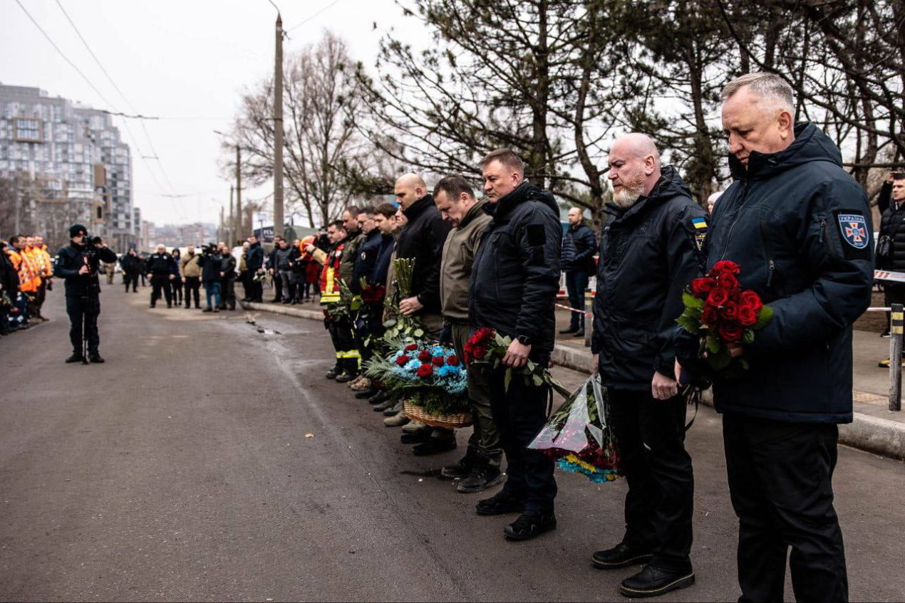 Квіти в пам’ять про безневинні життя, які забрали росіяни, принесли до потрощеного будинку разом з рятувальниками, поліціянтами, волонтерами і керманичем Дніпра.