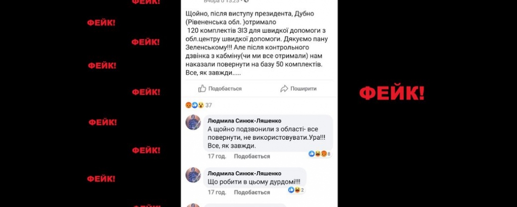 “Швидше від вірусу продовжують поширюватися фейки. Учора в мережі з’явилася неправдива інформація стосовно перерозподілу засобів індивідуального захисту (ЗІЗ), призначених для лікарів швидкої міста Дубно. Йшлося про те, що нібито була дана вказівка 50 комплектів засобів індивідуального захисту передати на інших медзаклад. Це не відповідає дійсності.