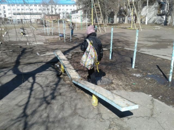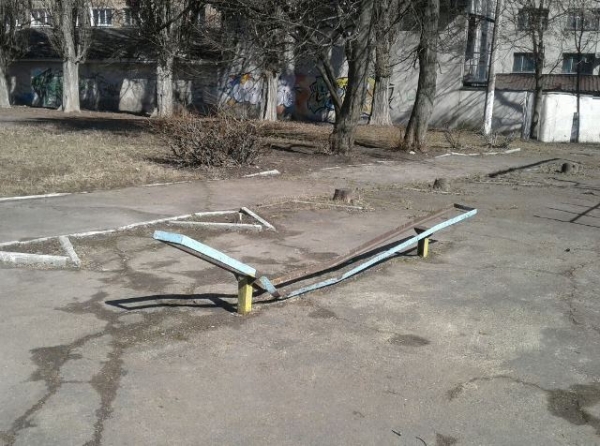 Спортивні снаряди – поламані, з обдертою фарбою. Такі ж поламані лавочки. А ще на ньому асфальтове покриття – нерівне і потріскане.