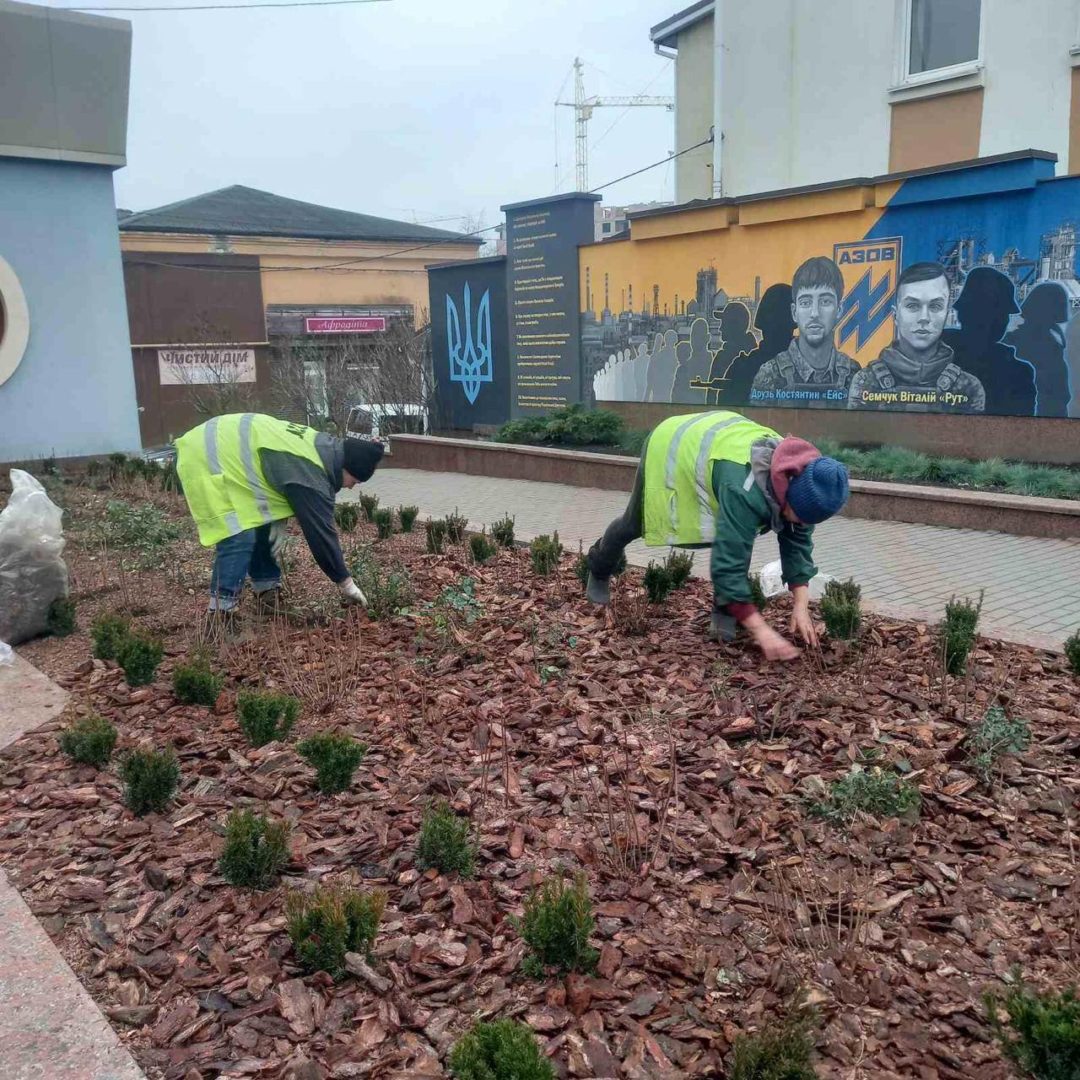 Паралельно комунальниці на Театральній площі проводять сезонне оновлення клумби: формують кущі, прибирають відцвілі рослини, висаджують нові квіти та доповнюють композицію декоративною корою.