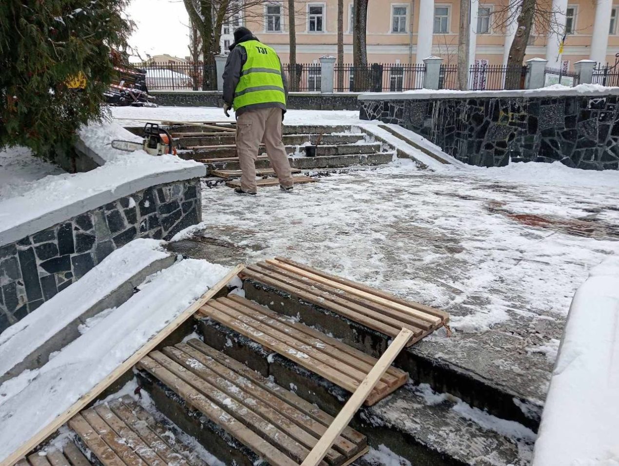 У Рівному працівники Тресту зеленого господарства встановили дерев’яні трапи на сходах на вулицях та в парках міста, щоб зменшити ризик травмування пішоходів у зимовий період.