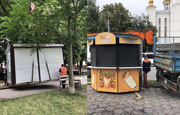- Тимчасова споруда (з продажу кавових напоїв) на перетині вул. Гагаріна та просп. Князя Романа (біля ресторану “Левада”).