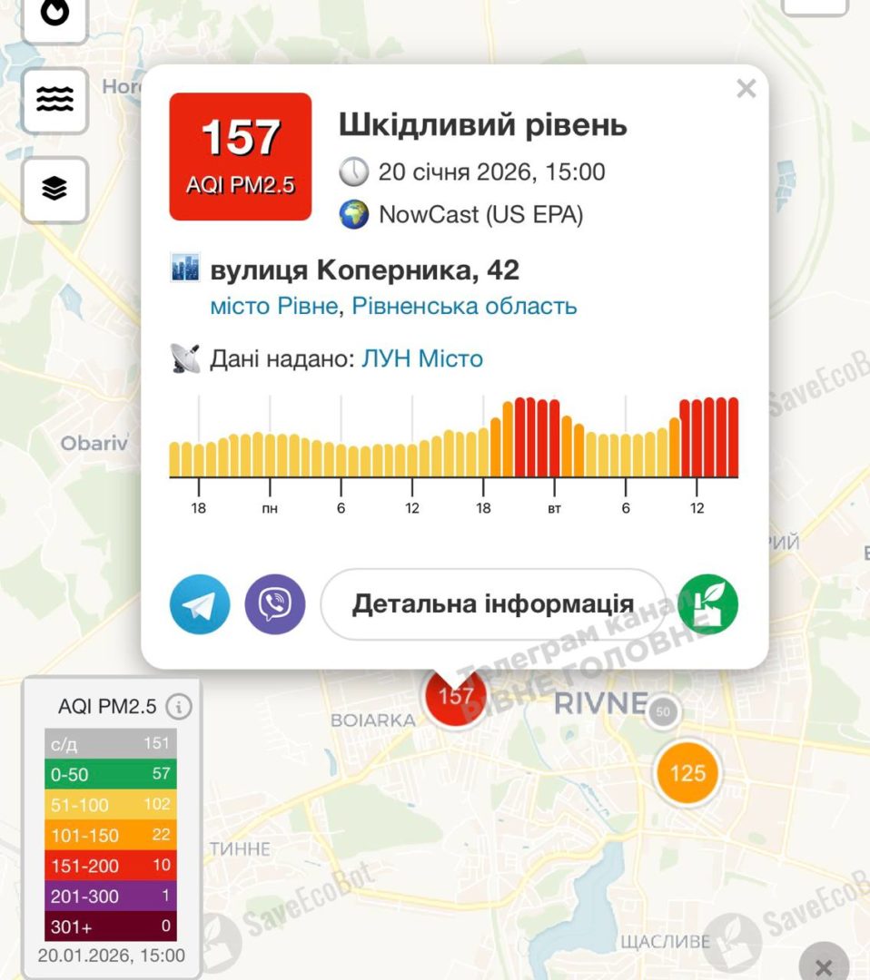 У Рівному зафіксовано шкідливий рівень забруднення повітря, який може негативно впливати на самопочуття людей. Про це повідомляють екологічні служби.