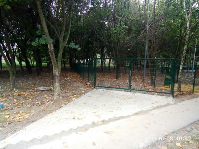 Майданчик обгороджено парканом. Там встановлені смітники, атракції для тварин, доріжки та лавки.