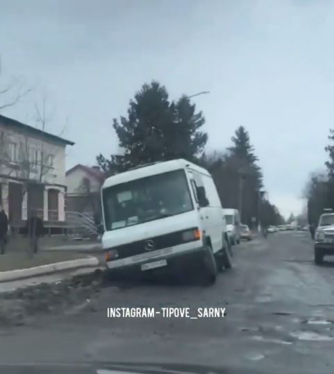 На Рівненщині на центральній вулиці Рокитного маршрутка застрягла в ямі на невідремонтованій дорозі .