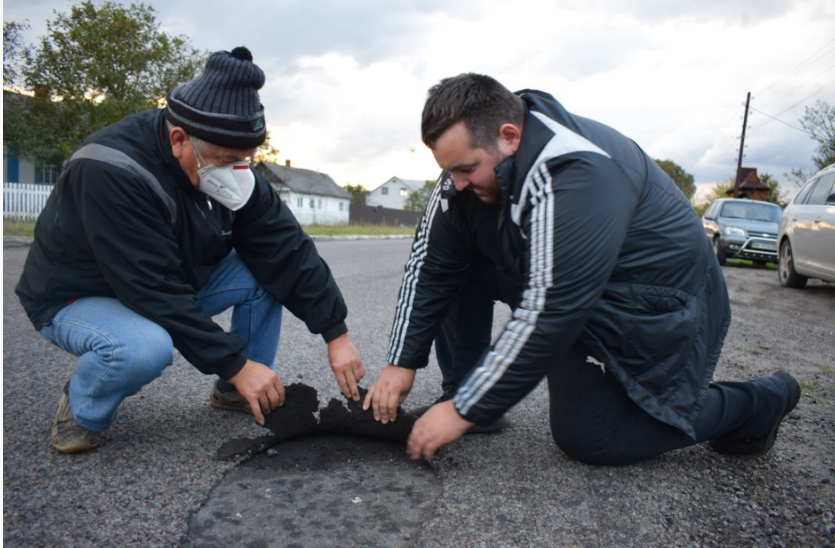 Тим часом учасники зборів показують саму дорогу і скаржаться на якість ремонту. Хто б міг подумати, що таке можна побачити не лише в інтернеті, а й у себе під боком: нове покриття можна просто відколупати пальцями, зняти, як шар застиглого пластиліну…