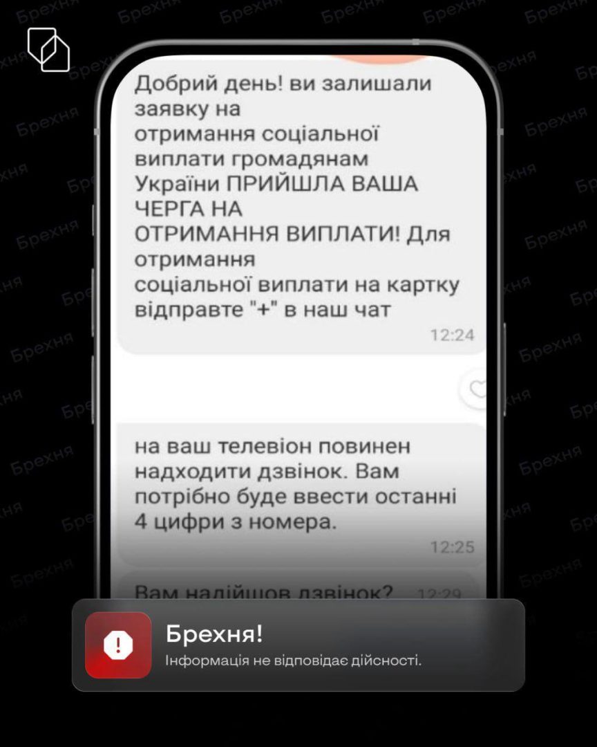 У повідомленнях аферисти заявляють, що людина начебто отримала право на грошову допомогу, і пропонують натиснути певний символ або кнопку, щоб «стати в чергу» та очікувати дзвінка.