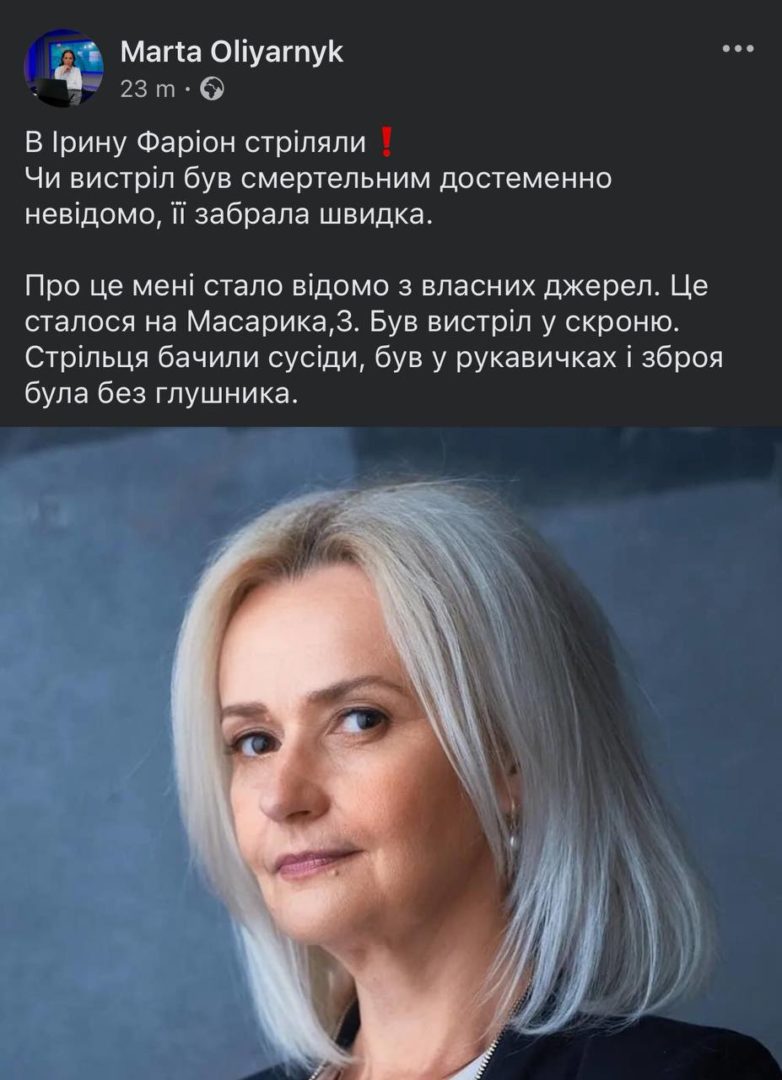ЗМі пишуть, що у Львові підстрелили Ірину Фаріон. Про це також повідомляє ведуча каналу “Еспресо”.