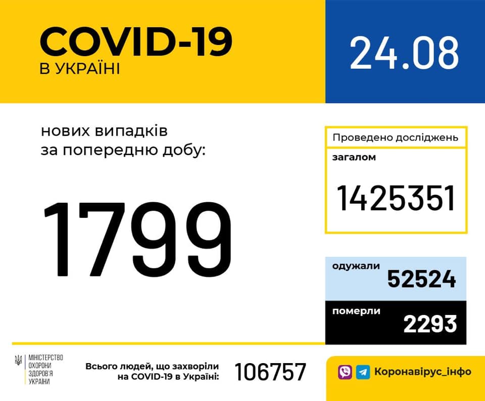 24 серпня (станом на 9:00) в Україні 106 757 лабораторно підтверджених випадків COVID-19, з них 2293 летальні, 52 524 пацієнти одужали. За добу зафіксовано 1799 нових випадків. Загалом проведено 1 425 351 тестування методом ПЛР. Усього за добу одужало 289 пацієнтів.
