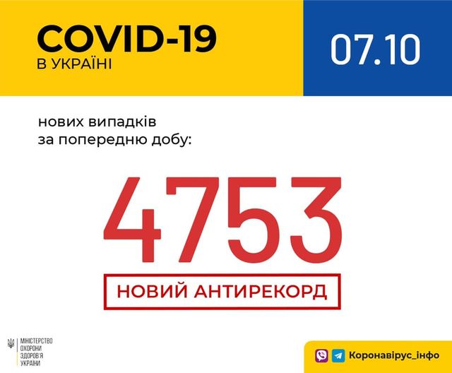 В Україні зафіксовано 4 753 нових випадки коронавірусної хвороби COVID-19 — це антирекорд кількості нових хворих за добу