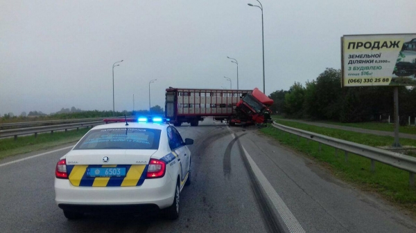 На трасі Київ-Чоп зіткнулися дві вантажівки DAF та Volvo. Одна з них перегородила одразу дві смуги руху.