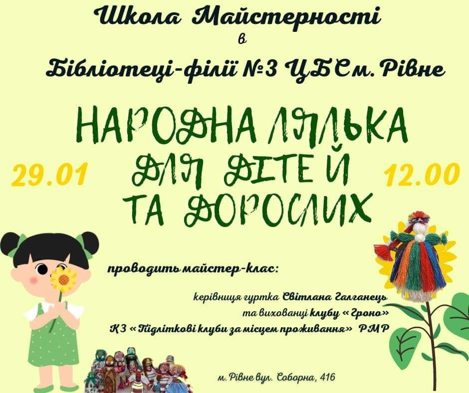 “Запрошуємо рівнян та гостей громади 29 січня долучитися до Школи Майстерності “Народна лялька для дітей та дорослих”, – йдеться у повідомленні.