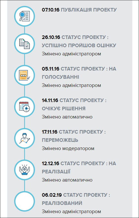 У кінці 2018 року на сайті громадського бюджету оголосили про «успішну реалізацію проєкту» на 355 тисяч гривень.