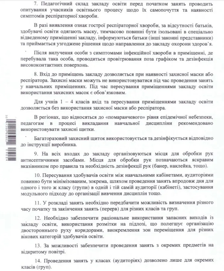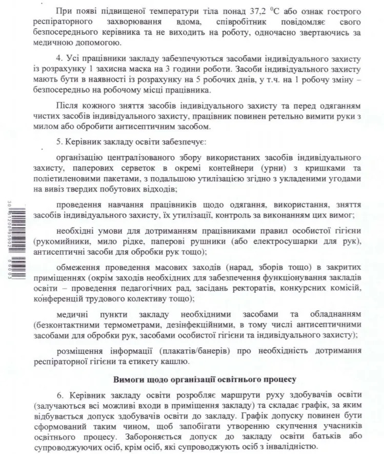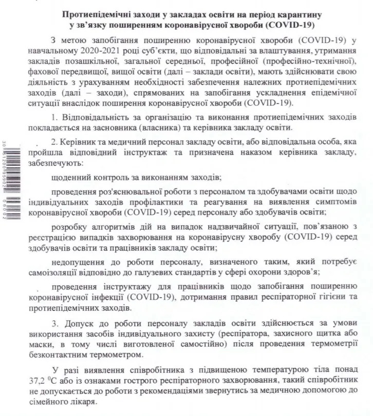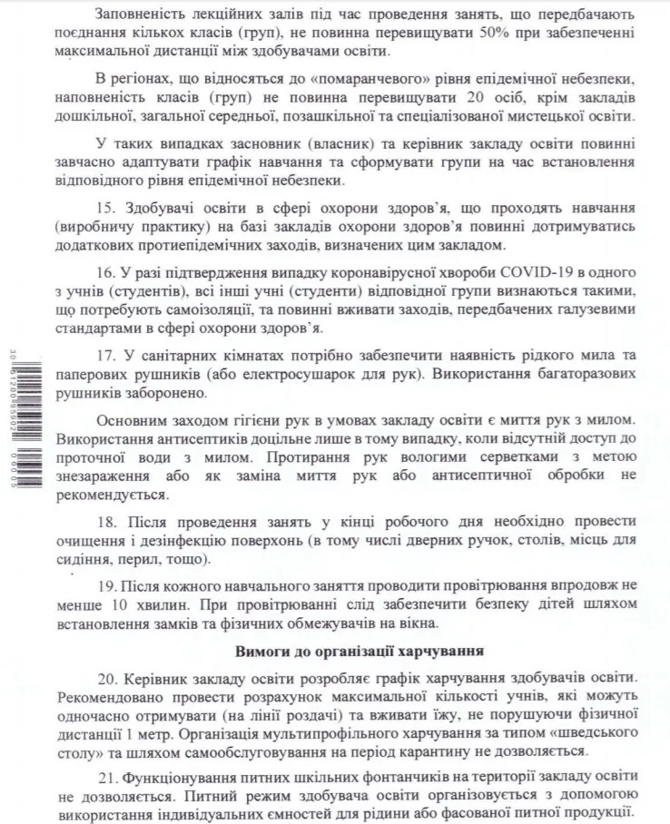 Документ оприлюднили на сайті Міністерства охорони здоров’я. У навчальних закладах обмежать масові заходи, проведуть розмітку території й заборонять організацію харчування за зразком шведського столу.