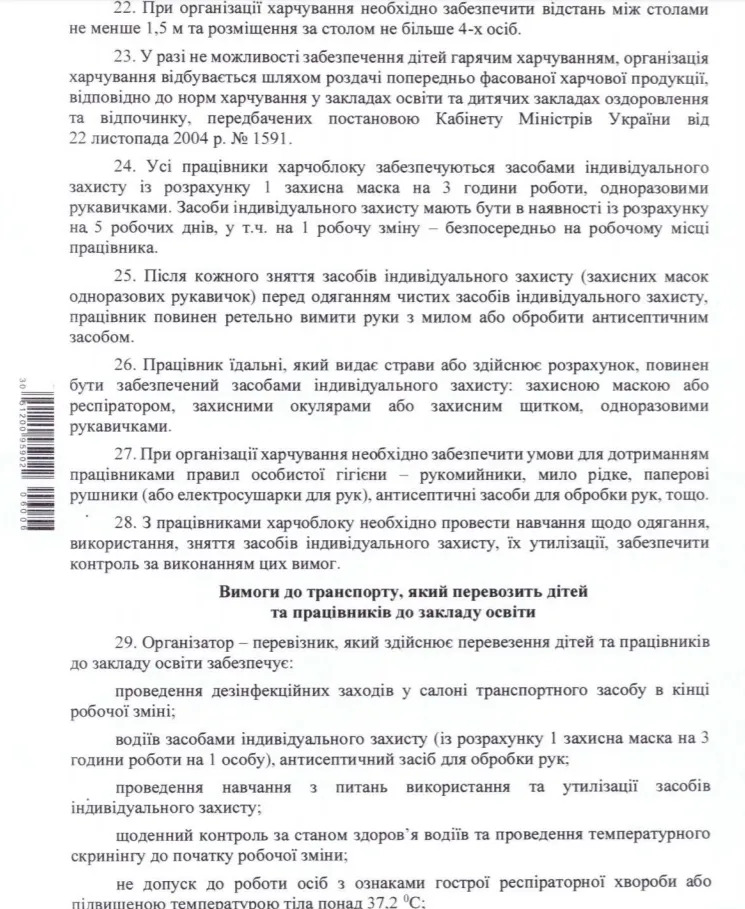 - У шкільному транспорті необхідно забезпечити водіїв масками/респіраторами і антисептиками для рук, щодня контролювати їхній стан здоров’я й не допускати до роботи осіб із ознаками гострої респіраторної хвороби і температурою вище 37,2 градуса.