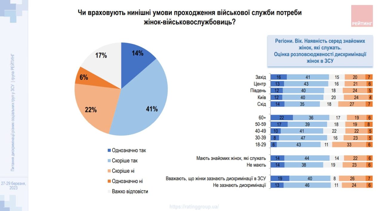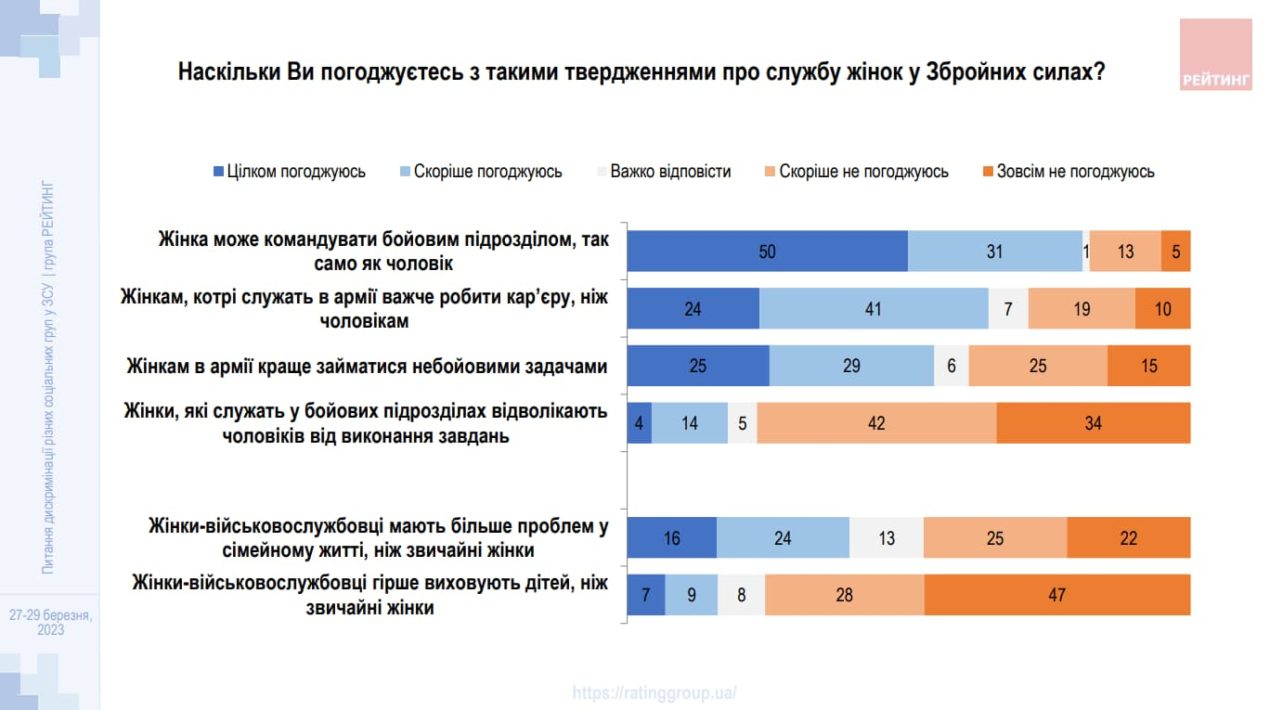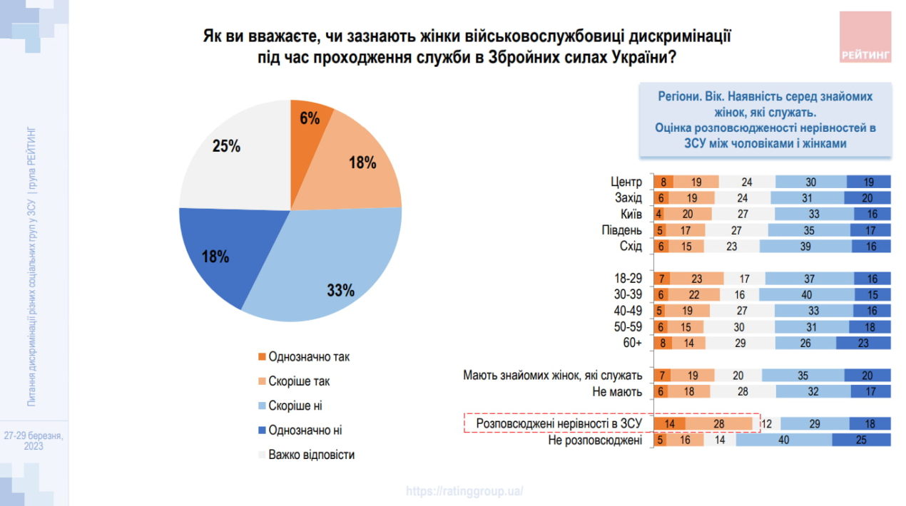 Майже чверть українців вважає, що українські жінки зазнають (6%) чи «скоріше зазнають» (18%) дискримінації під час служби в лавах ЗСУ, свідчить опитування соціологічної групи «Рейтинг», проведене спільно з Українським ветеранським фондом Мінветеранів і Незалежною антикорупційною комісією (НАКО).