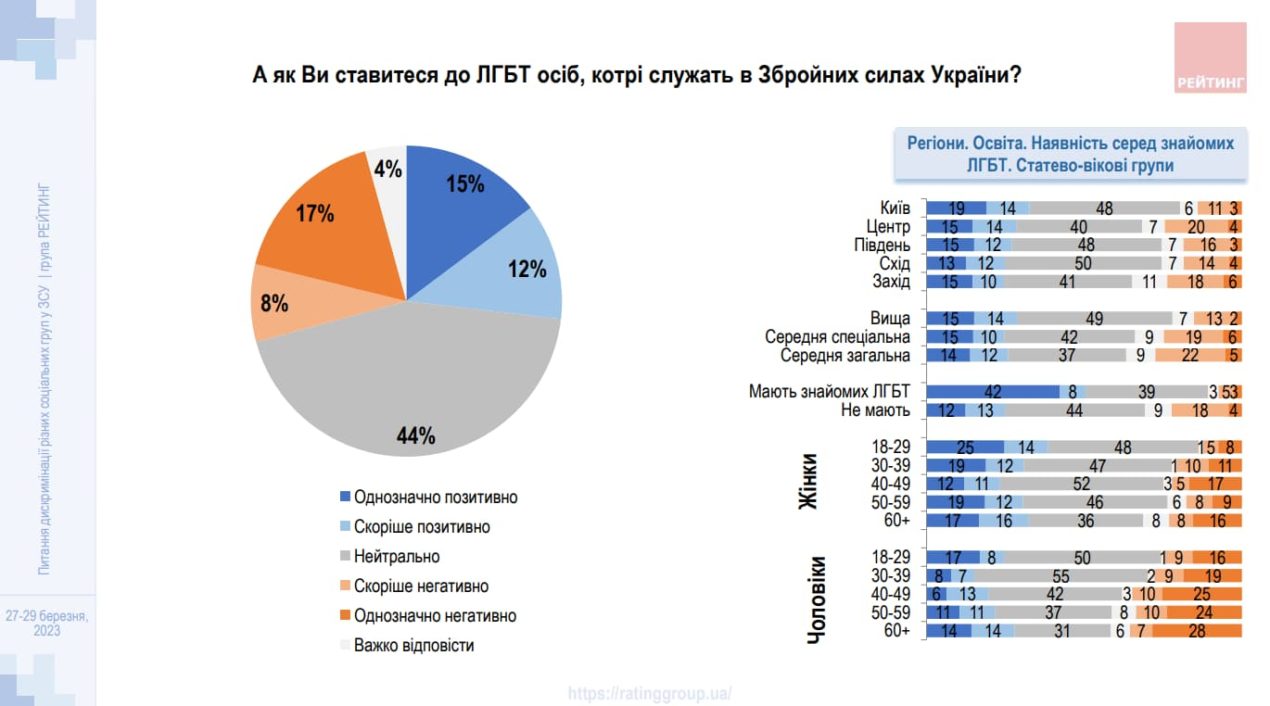Щодо ставлення до ЛГБТ-спільноти в лавах ЗСУ, то в 44% опитаних воно нейтральне; у 17% – однозначно негативне, у 8% – радше негативне.