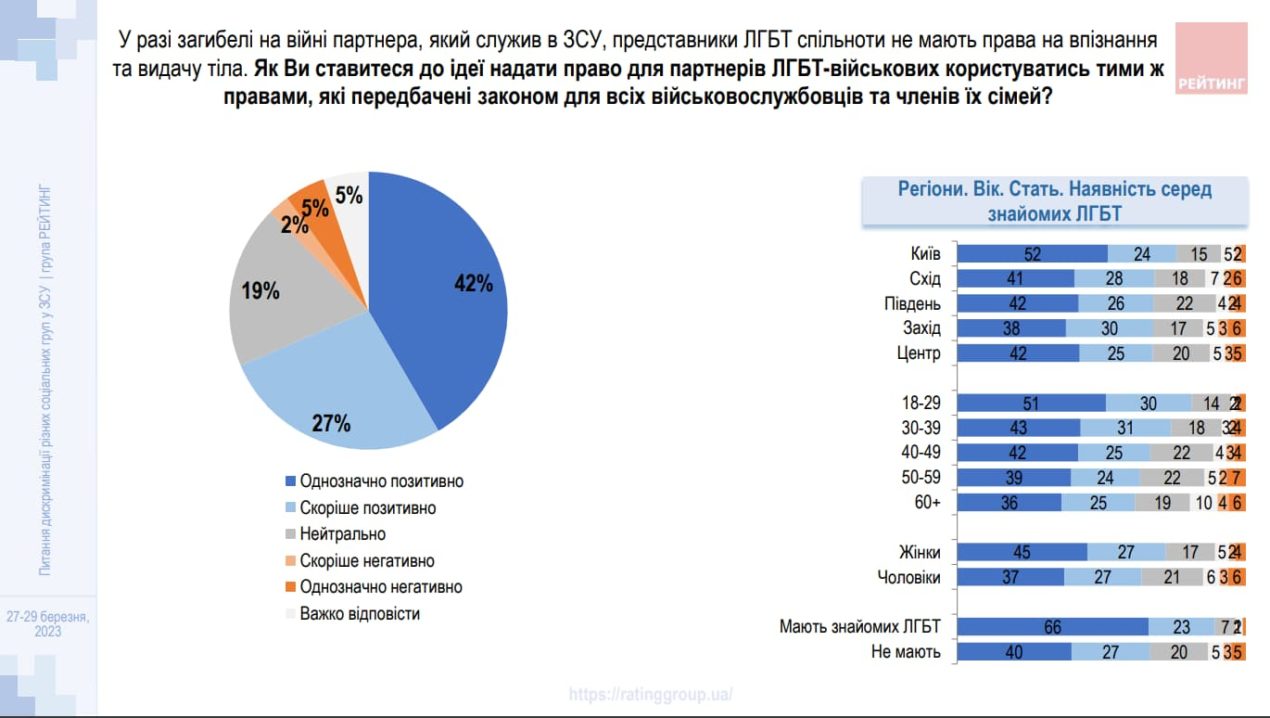Водночас 42% респондентів позитивно ставляться до ідеї надати представникам ЛГБТ-спільноти право користуватися такими самими правами, які передбачені законом для військовослужбовців і їхніх родин (наприклад, забрати тіло загиблого партнера).