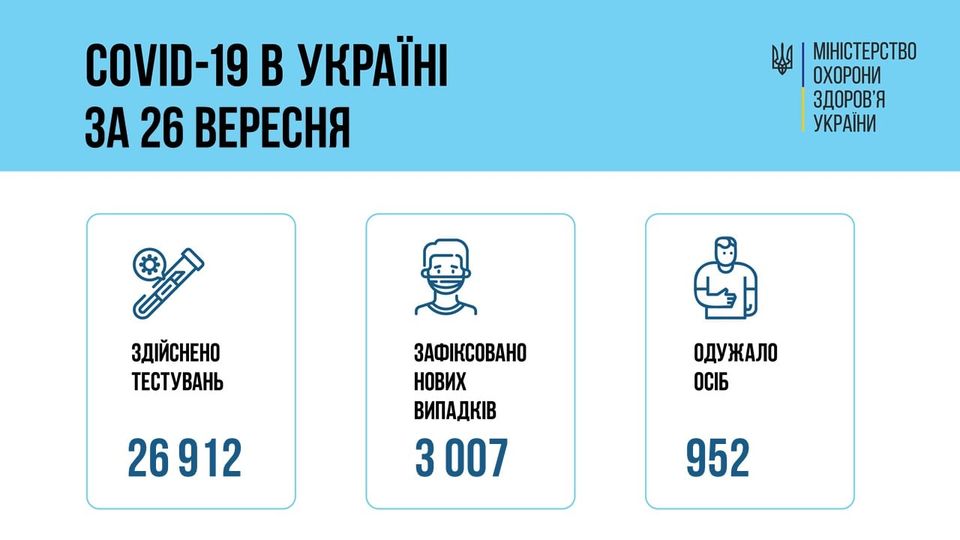 За добу 26 вересня 2021 року в Україні зафіксовано 3007 випадків COVID-19