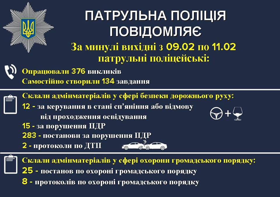 Патрульна поліція опублікувала звіт за минулі вихідні. Правоохоронці опрацювали 376 викликів, 12 з них за водіння в нетверезому стані та 283 постанови за порушення ПДР