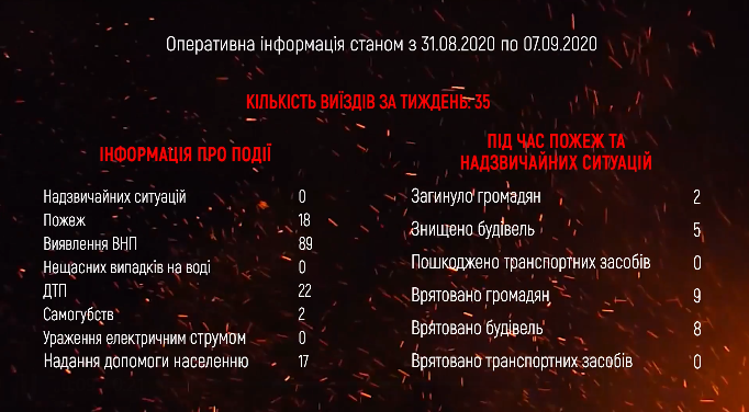 У період з 31.08.2020 по 07.09.2020 було здійснено 35 виїздів на ліквідацію пожеж, надання допомоги та знищення боєприпасів часів війни.