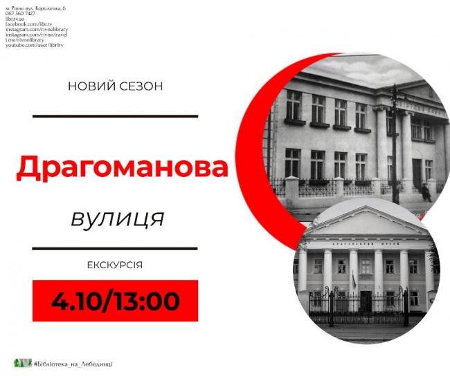 Рівненська обласна бібліотека продовжує організовувати екскурсії вулицями обласного центру. Завтра працівники головної книгозбірні області проведуть екскурсію вулицею Драгоманова. Початок о 13:00.
