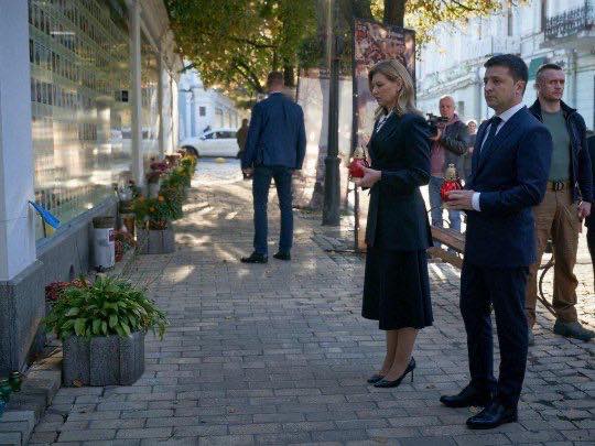 Президент України Володимир Зеленський і перша леді Олена Зеленська прийшли до Стіни пам’яті полеглих за Україну, що біля Михайлівського Золотоверхого монастиря у Києві.