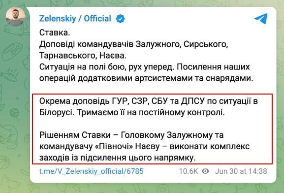 Через перекидання “вагнерівців” у білорусь Залужному та Наєву наказано посилити північний напрямок України, — Зеленський.