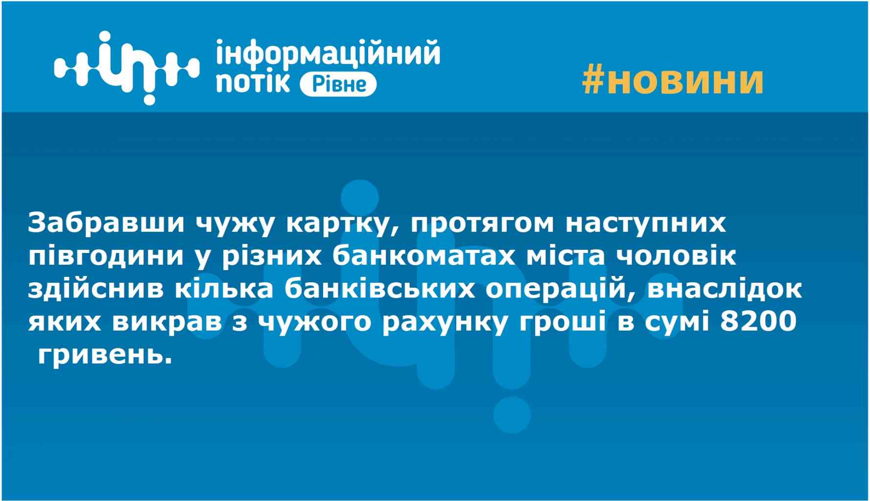 Того вечора молодик помітив біля терміналу жінку, яка використовувала банківську картку. Спостерігаючи за нею, чоловік запам’ятав код, який вона вводила, та побачив, що після здійснення необхідних операцій жінка забула картку у терміналі. Забравши чужу картку, протягом наступних півгодини у різних банкоматах міста чоловік здійснив кілька банківських операцій, внаслідок яких викрав з чужого рахунку гроші в сумі 8200 гривень.